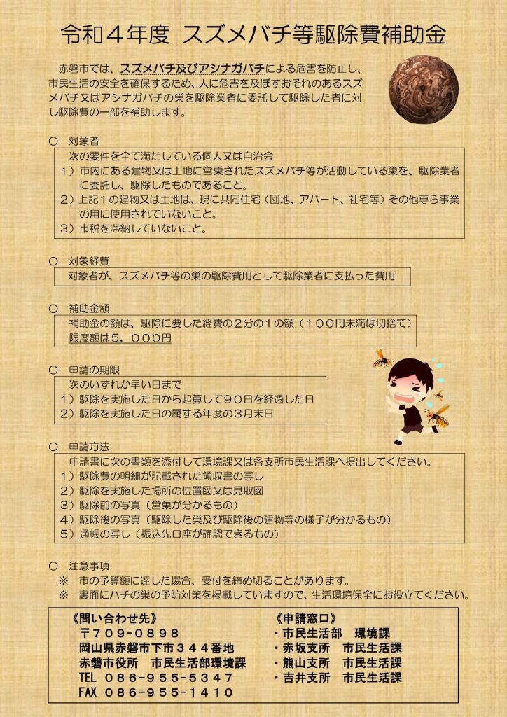 「くらし・手続」→「環境・衛生」→「赤磐市スズメバチ等駆除費補助金」よりご確認ください。